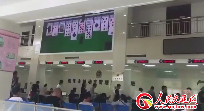 澎湃新闻获得的视频显示,在焦作机动车管理所大厅的屏幕上,出现一个电脑扑克游戏界面,上面的鼠标正在操作扑克牌。