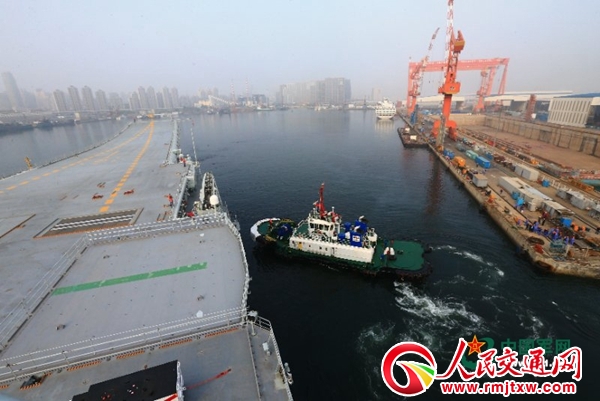 中国军网大连5月13日电 侯融、记者陈国全报道:今天上午7时许,我国第二艘航母从大连造船厂码头启航,赴相关海域执行海上试验任务。主要检测验证动力系统等设备的可靠性和稳定性。据了解,自去年4月26日下水以来,第二艘航母建造工作按计划稳步推进,完成了系统设备调试、舾装施工和相关系泊试验,具备了出海试验的技术条件。