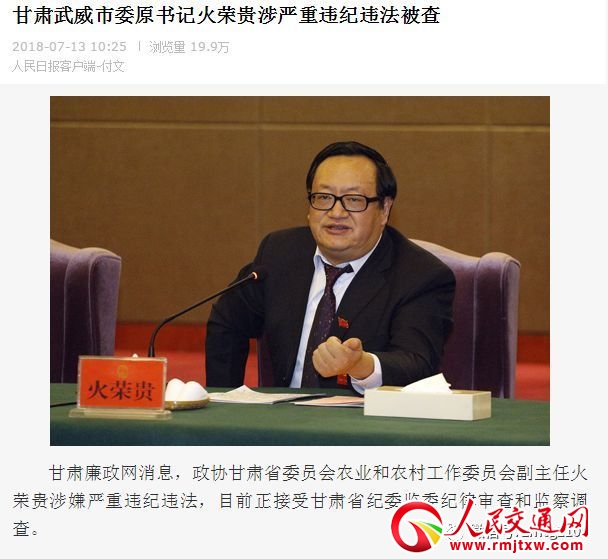 时间:2018-07-17 来源: 作者:7月13日,人民日报客户端援引甘肃廉政网消息,政协甘肃省委员会农业和农村工作委员会副主任火荣贵涉嫌严重违纪违法,目前正接受甘肃省纪委监委纪律审查和监察调查。