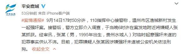 时间:2018-09-18 来源: 作者:中新网9月15日电 据浙江省温州市公安局鹿城分局官方微博消息,9月14日晚,温州市鹿城区洪殿住宅区一出租房内,发生一起中通快递员对出租房女房客实现强暴犯罪的案件,针对这一案件,鹿城警方今日发布通报称,已于当晚6时许在案发地附近将嫌疑人张某抓获。
