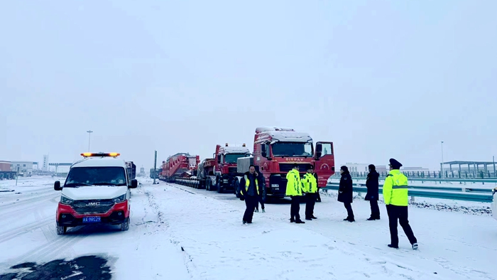 12月21日,因下雪路面结冰,通行存在风险,车辆于当日18时20分到达火烧山匝道停车,为确保车辆安全顺利通行,支队提前对接交投集团昌吉分公司,对高速公路铺洒融雪剂,对前方道路积雪进行清理,12月22日将大件运输车辆安全送至目的地华电英格玛电厂,顺利完成护送任务。