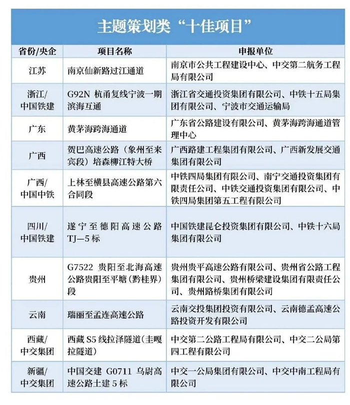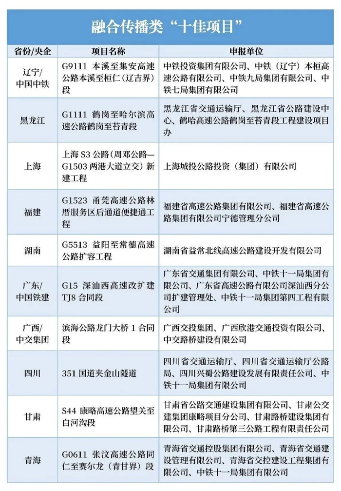 日前,由中国交通报社与中国交通报刊协会联合组织的2023年公路重大工程新闻宣传“十佳项目”推选展示活动完成终评,来自交通运输部有关司局、部专家委员会、交通投资建设企业和新闻院校的专家组成评审委员会,评选出公路重大工程新闻宣传“十佳项目”10个、主题策划类“十佳项目”10个、融合传播类“十佳项目”10个、创意创新类“十佳项目”10个。