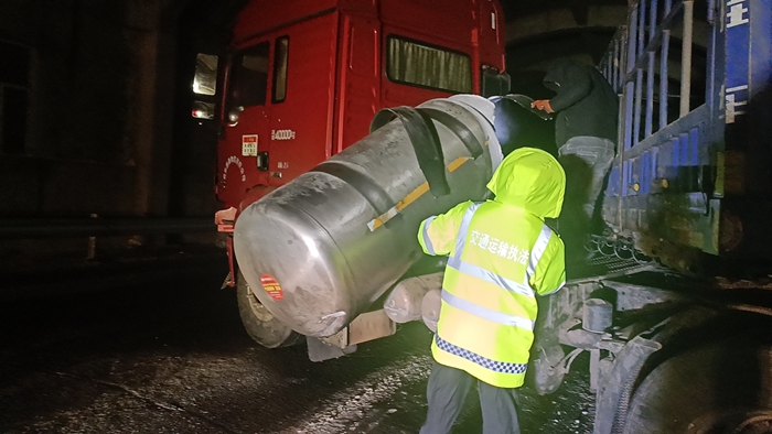 时间:2024-01-16 来源: 新疆维吾尔自治区交通运输厅 作者:佚名近日,连续的雨雪天气导致路面状况恶劣。额敏执法大队执法人员在执行巡查任务返回途中,发现省道201线35公里处的棚洞内,一辆货车失控撞上了护栏。事故导致货车加气罐失衡倾倒于一侧,司机一度陷入困境。