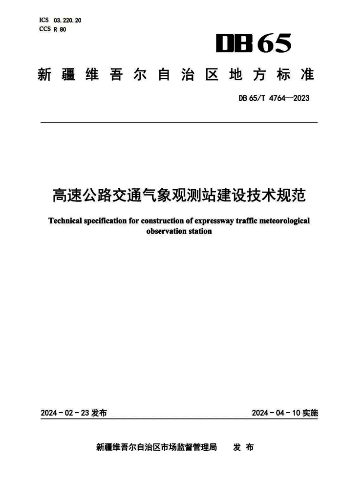 时间:2024-04-12 来源: 新疆维吾尔自治区交通运输厅 作者:佚名由交通运输厅路网监测与应急处置中心牵头组织,新疆交通科学研究有限责任公司、自治区气象服务中心共同参与编写的新疆维吾尔自治区《高速公路交通气象观测站建设技术规范》地方标准,于2024年4月10日由自治区市场监督管理局正式发布实施。