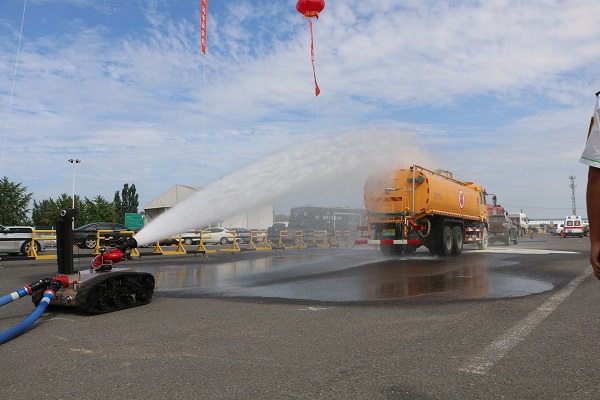 下午两点半,随着应急演练总指挥的指令,演练活动正式开始。现场模拟一辆油罐车追尾大货车,造成两车人员受伤且油罐车车头起火事故。当班班长接到油罐车司机的求助后,立即报告值班站长,并迅速展开救援。值班站长及时上报并拨打报警电话后,带领临时救援小组投入救助行动。随后,119消防车辆赶到现场,对变形车体进行人工破拆,使用智能消防机器人进行罐体降温和灭火,120急救车对伤员进行紧急救护。