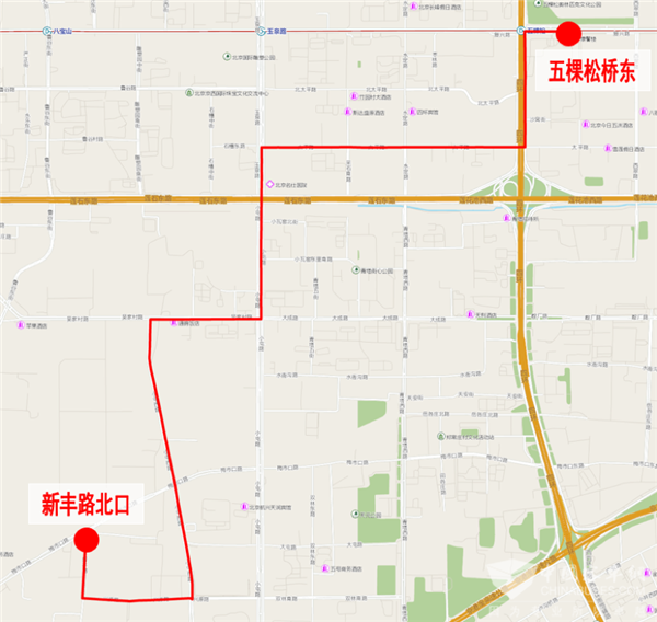 首末站:新丰路北口五棵松桥东(返回:五棵松桥东张仪村南站)