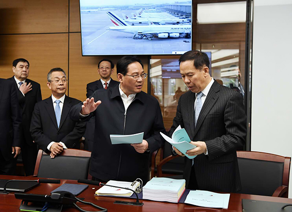 东航集团作为我国三大国有骨干航空运输集团之一,年旅客运输量超过1亿人次,在全球航空公司中位列第七。李强一行来到位于虹桥机场2号航站楼南侧的“东航之家”察看,这里是东航新近启用的生产、运行、保障、协调中心。市领导详细了解东航全球航线网络、发展历程以及机场航班运行实时数据,对东航长期以来为推进上海国际航运中心建设、服务上海经济社会发展作出的贡献表示感谢。李强说,今年11月,首届中国国际进口博览会将在上海举办,希望东航牢牢把握这一重大机遇,充分发挥自身优势,不断提升服务水平,为广大旅客提供高品质的出行体验,为向全世界展示上海更加开放、文明的卓越形象作出贡献。