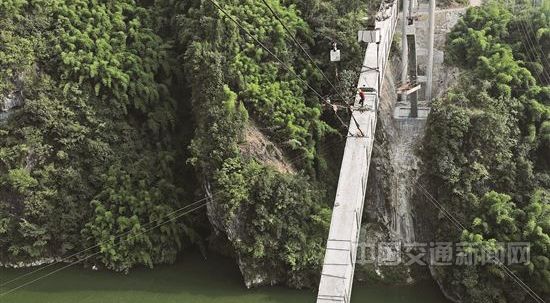 重庆市黔江区官渡峡两岸山高谷深,将城区与几个乡镇隔断。2018年,重庆对304省道正阳至蓬东公路进行改建,提升周边乡镇群众出行和运输条件,助推脱贫攻坚和乡村振兴。 作为正蓬公路改建的重点控制性工程,官河大桥全长287米,横跨官渡峡。目前,大桥已进入桥梁吊装拱箱安装施工阶段,预计今年年底建成初通车。 图为施工人员在官河大桥上吊装拱箱。