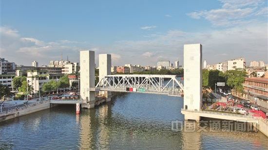2.5分钟就可将整座桥面提升近8米,道路、水路均兼顾。近日,广东省内最大跨径、最大提升重量的直升式开启桥——广州市番禺区光明大桥正式开通。 据介绍,光明大桥全长约116米,桥宽24米,两侧各设4米人行道。该桥由中交四航院负责设计,在国内首创斜向布置开启结构,与桥位处弯曲的河流现状相适应。大桥的开通,将缓解市桥城区拥堵状况。