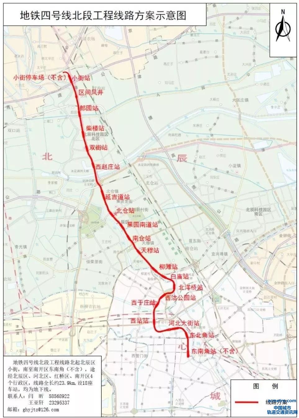 天津地铁4号线北段工程北起北辰区小街,南至红桥区河北大街,线路经:京津公路-西站-三条石大街。沿线经过北辰区、河北区、红桥区3个行政区。