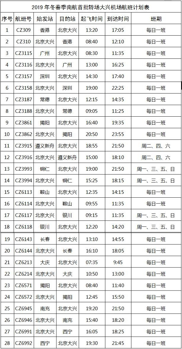 时间:2019-10-24 来源: 作者:10月27日,民航即将迎来2019年冬春换季。记者从南航了解到,新航季南航北京往返广州、深圳、香港等13条航线将率先转场至北京大兴国际机场运行,每周航班量176班次,平均每日25班,占南航在北京航班比例超过10%。