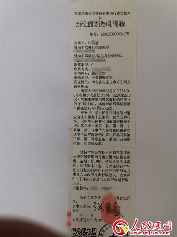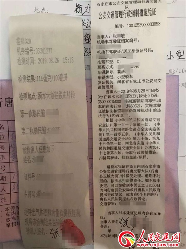 当民警要求该车驾驶人进行呼吸式酒精测试时,司机却以各种理由拒绝酒精检测,还说自己没喝酒。当民警要求查看其驾驶证时,司机一会说在车上,一会儿又说丢了。经民警利用警用系统查询发现,该车驾驶人张某敏于5月20日14时46分,饮酒后驾驶车辆,被行唐公安交警城区中队处罚,驾驶证扣留。但是,张某敏依旧我行我素,在驾驶证扣留期间,于8月20日15时因醉酒驾驶冀A***WT小型越野客车,再次被城区中队查获,至今尚未接受处理。