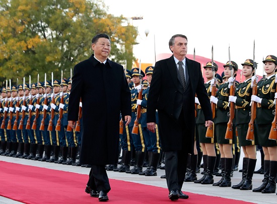 习近平欢迎博索纳罗首次访华,感谢他在中华人民共和国成立70周年之际发来热情洋溢的贺电。习近平指出,中国和巴西分别是东西半球最有代表性的新兴市场国家和最大的发展中国家。中巴建交45年来,双方始终相互尊重、平等相待、互利共赢,成为发展中大国团结合作、共同发展的典范。当今世界正经历百年未有之大变局,但和平、发展、合作、共赢的时代潮流没有变,中国、巴西等新兴市场国家整体崛起的势头没有变,中方从战略高度和长远角度发展中巴关系的政策没有变。当前,中国和巴西都处在国家发展的关键时期,我们要总结过去、展望未来,开辟中巴全面战略伙伴关系新愿景,为维护世界和地区的和平、稳定与繁荣贡献正能量。