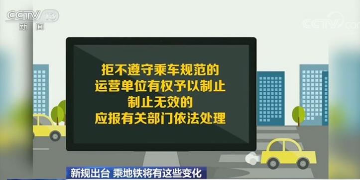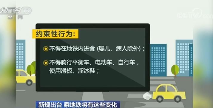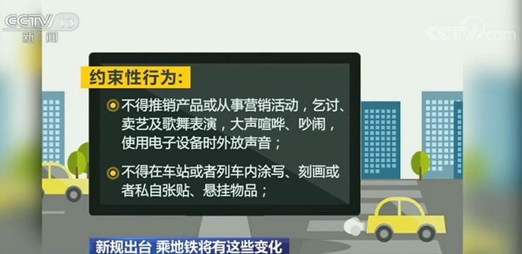 乘客行为如何规范?《办法》明确,10类影响运营安全和7类影响秩序的行为要禁止。约束性行为包括:乘客不得在地铁内进食(婴儿、病人除外),不得骑行平衡车、电动车、自行车,使用滑板、溜冰鞋。不得推销产品或从事营销活动,乞讨、卖艺及歌舞表演,大声喧哗、吵闹,使用电子设备时外放声音;不得在车站或者列车内涂写、刻画或者私自张贴、悬挂物品;不得携带动物(导盲犬、军警犬除外)进站乘车,携带有严重异味、刺激性气味的物品进站乘车;以及在地铁里随地吐痰、便溺、乱吐口香糖,乱扔果皮、纸屑等废弃物,躺卧或踩踏座席和在车站和列车内滋扰乘客的其他行为都是属于影响秩序的约束性行为。