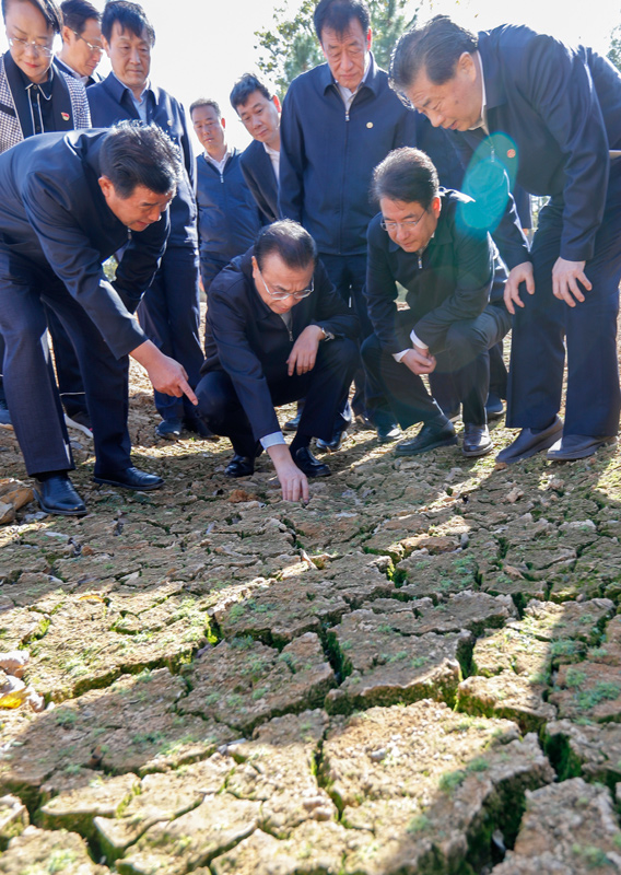 李克强11月14日上午考察江西旱情。一下飞机,总理直奔景德镇山田水库。据介绍,该水库始建于1958年,目前水量为历史同期最低。在一处干涸的水库边,李克强蹲下身抠起一块泥土说:“这里旱得可不轻啊!”他对当地兴修水利、节水灌溉等提出具体要求,要求把旱情带来的损失力争降到最低。粮食生产历来是总理十分关心的问题。他来到附近一处晚稻田,向农民询问水稻价格、收成,种粮成本等。总理说,农业是基础的基础,一定要保护农民种粮的积极性,把近14亿人的饭碗牢牢端在自己手里。总理还先后走进附近两户村民家中,仔细了解村民收入、打工等情况。他特别关心他们多久可以吃一顿肉,并掀开盖帘,察看剩饭剩菜。他来到房前屋后察看是否养猪养禽。村民告诉总理,因为猪仔价格太高,只养了几只鸭。总理对当地负责人说,国家既支持发展规模养猪,同时也支持农户散养。