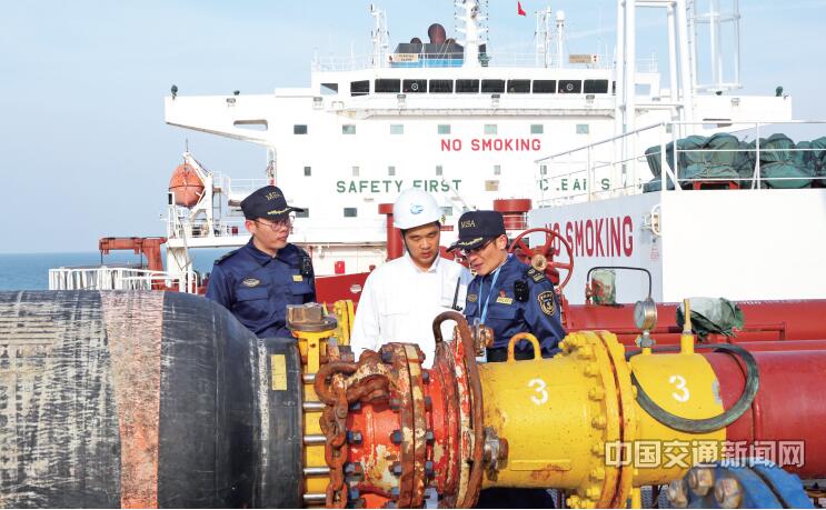 日前,山东烟台海事局执法人员登上正在进行提油作业的十万吨级油轮“北海名望”轮,实施船舶现场执法监督检查(如图)。 今年以来,烟台海事局对辖区海上钻井平台周边水域通航安全与船舶防污染情况开展空中巡航,保障海上安全形势持续稳定,服务海洋经济发展。今年,该局已审批保障了辖区内2座海上油田开展大型油轮提油作业67船次、约430万立方米。