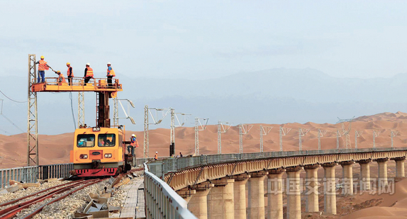 12月18日,随着肃北至马海区段正式通车,标志着敦煌铁路全线开通运营,西北地区形成首条环形铁路网,为甘肃、青海、新疆、西藏四省区经济社会发展和沿线地区脱贫攻坚增添了“新引擎”。 敦煌铁路北起敦煌站,穿越祁连山脉进入青海省,沿青海马海、大柴旦,引入青藏铁路西格段饮马峡站,线路全长671公里,中铁电气化局员工在120余公里的沙漠无人区内筑起了一条电气化大动脉。该铁路串联起兰青、兰新、青藏铁路,与库格铁路相交形成西北通向中亚的第二条国际大通道,改变了新疆、西藏乃至中亚国家之间铁路运输迂回绕行的历史,新疆和西藏之间运输距离将缩短1100公里,节省时间近10小时,极大地方便了沿线群众出行。 图为建设者在沙漠、戈壁中架线。