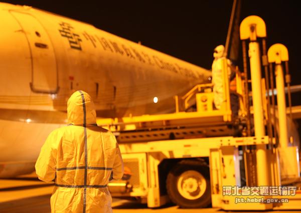 1月24日21时37分,载有10吨货物的中国邮政航空南京-石家庄CF900T航班降落在石家庄机场。这是石家庄机场此次疫情发生后恢复的首条航线,该航线每天一班。在快速卸货后,该飞机又装载6吨货物于23点02分飞往南京。
