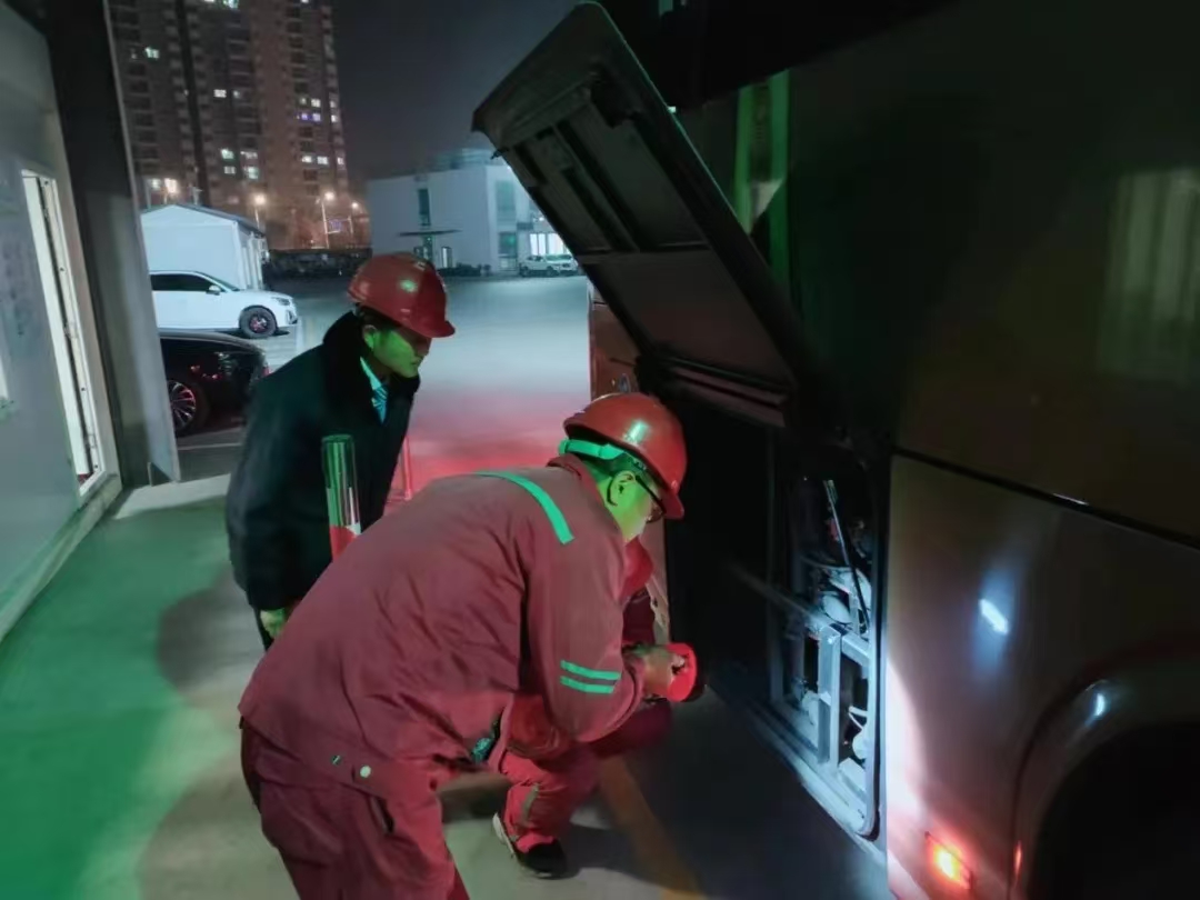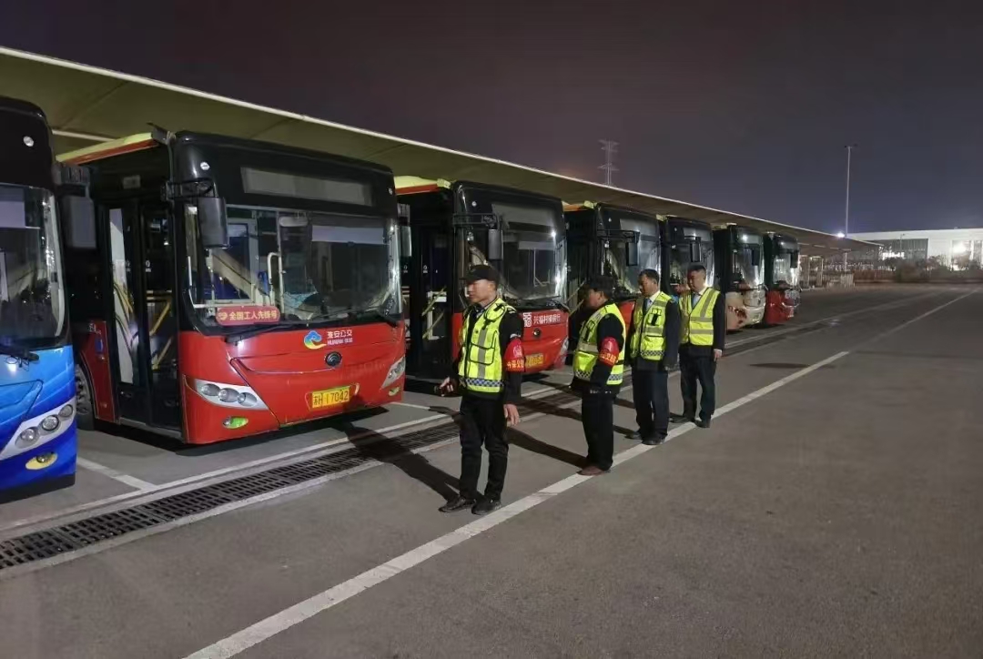 停车场里星光点点,修理车间灯火通明,驾驶员和例保员配合默契,仔细检查着每一辆公交车的车身、底盘、发动机等关键部位。他们目光如炬,手法熟练,每一次敲击、每一个转动,都是对车辆安全的严格把控。