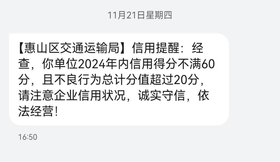 通过对各平台数据库进行深入分析、去重比对梳理,筛选出违法失信企业,并启动“云提醒”服务,通过短信形式向这些企业发出信用状况提示,敦促企业诚实守信、依法经营,尤其是对存在违法超限运输、擅自从事危险货物运输等严重不良行为被直接评定为D级的企业。